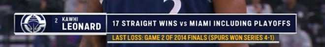 據統計,這是倫納德11年來首次負于熱火隊,上一次倫納德所效力的球隊輸給熱火還要追溯到2014年總決賽G2,在那場比賽中詹韋波三巨頭領銜的熱火擊敗了馬刺,將系列賽比分扳為1-1。在那之后,倫納德對陣熱火取得了17連勝。